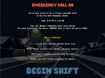 You've been called in for a 12-hour overnight shift at the City Snow Emergency Center during the worst blizzard of the season!